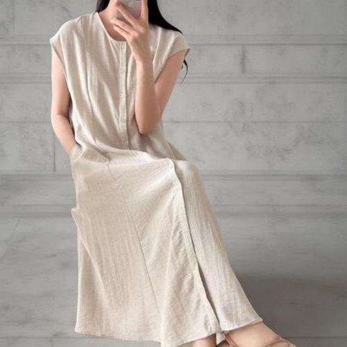 [신상오픈런]여성용 간결한 비스코스 린넨 버튼 민소매 롱 드레스
