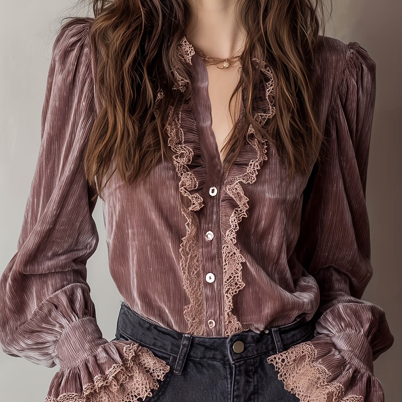 TEMU 우아한 모브 양피지 레이스 트림 블라우스 - 버튼 프론트 셔츠, 러플 칼라 & 짧은 소매, 세탁기 사용 가능한 사무실에서 캐주얼 탑, 봄/가을용 부드러운 갈색 작업복 (단색)|반팔블라우스