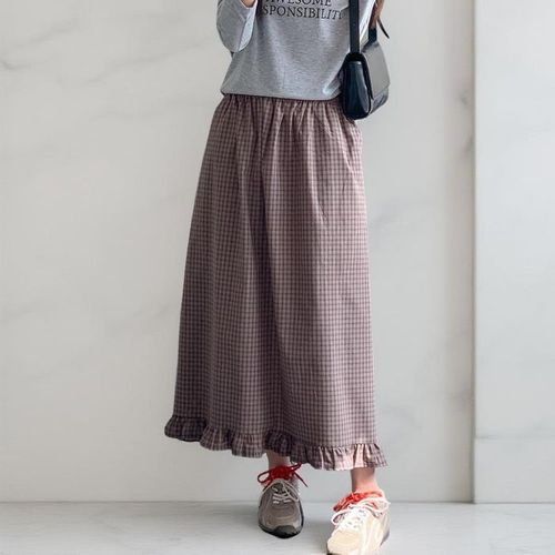 [옷자락] 여성 체크 스커트 프릴 빅사이즈 A라인 밴딩 롱 스커트