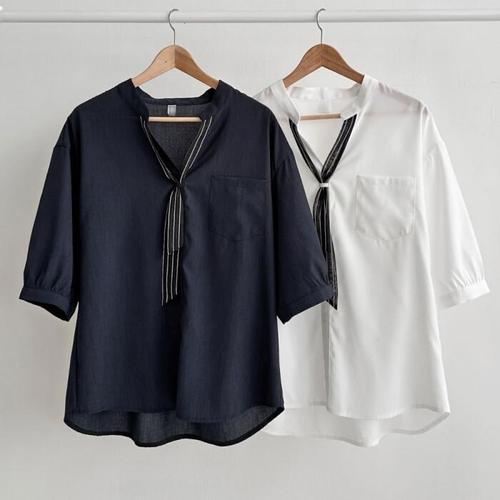 나야홍 / 빅사이즈반팔블라우스 P245L503 오픈카라줄타이블라우