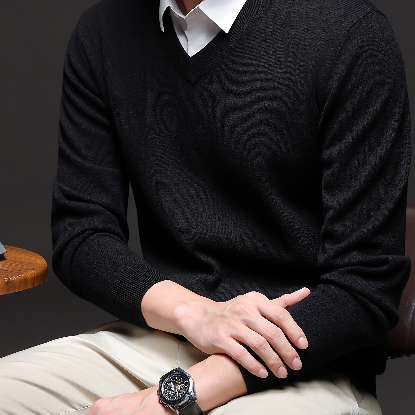 TEMU 신상품 수입 가을/겨울 남성용 단색 브이넥 니트 풀오버 스웨터