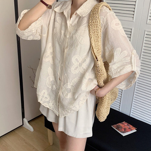 보니제이 / 카라넥 플라워 자수 빅사이즈 여름 베이지 시스루 여