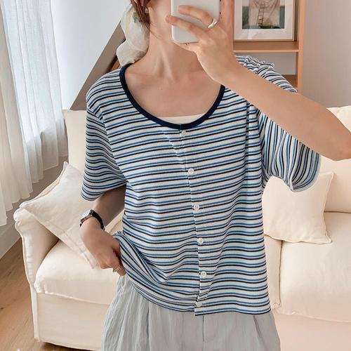 [신상오픈런]여성 스트라이프 링거 스쿱넥 빅사이즈 반팔 여름 카디건