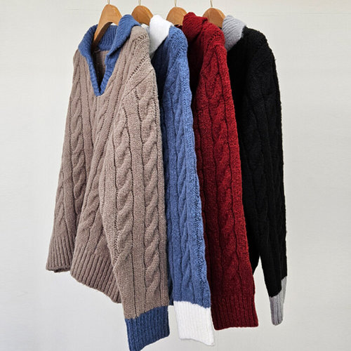 나야홍 / 빅사이즈도톰니트티 T609L502 꽈배기배색오픈카라티 E