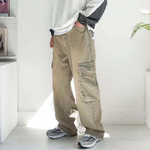 [쿼터]S-2XL 머드틴 빈티지 샌드 워싱 와이드 카고 데님 팬츠