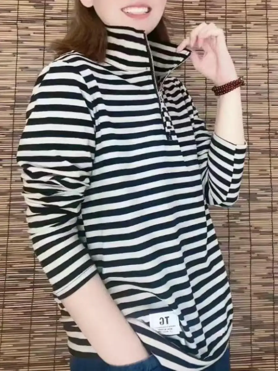 우아하고 심플한 스트라이프 베이스 셔츠 여성 플러스 사이즈 스탠드 칼라 반지퍼 디자인 포켓 손수건 패셔너블 캐주얼 웨어