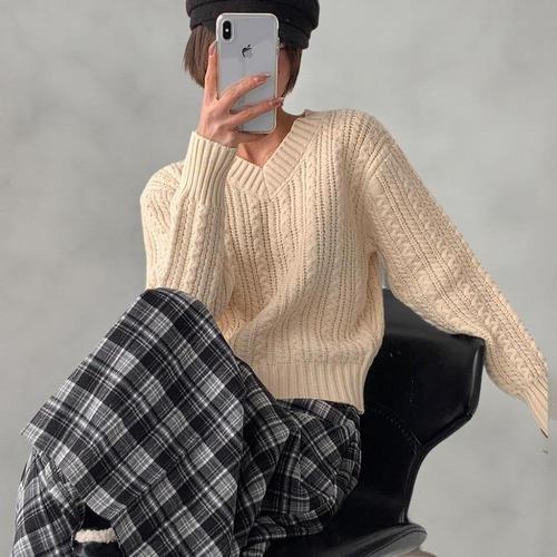 [옷자락]여성용 브이넥 빨간 꽈배기 니트 스웨터 겨울 데일리웨어