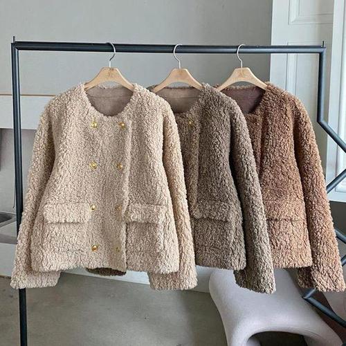 [옷자락] 여자 캐주얼 금장버튼 노카라 뽀글이 퍼 자켓