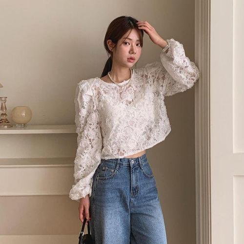 [옷자락]여성 러블리 플라워 프릴 세미시스루 크롭 블라우스