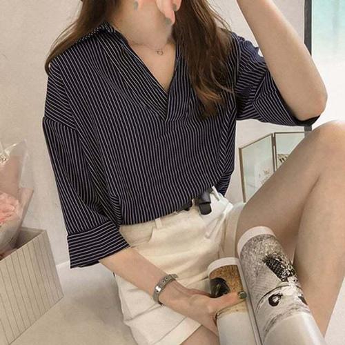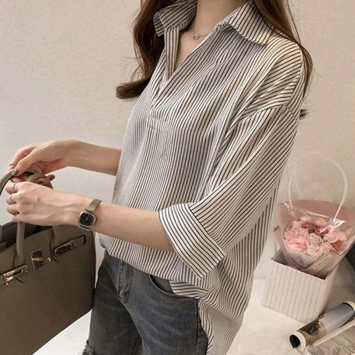 [셀럽하우스]여성 OQIX8962 반오픈카라 세로 남방 7부 스트라이프셔츠 2컬러