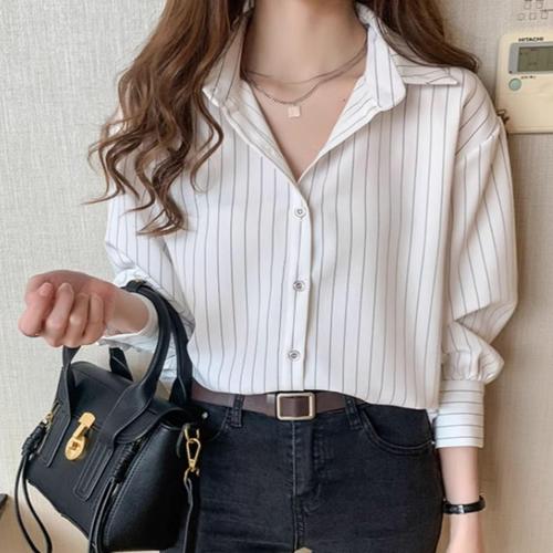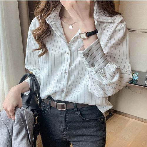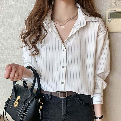 [셀럽하우스]여성 HIKD8082 깔끔한 세로 스트라이프 기본 셔츠 루즈핏 남방