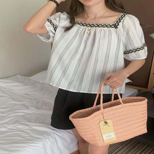 [셀럽하우스]여성 IFYC3304 세로 스트라이프 퍼프소매 자수 블라우스 셔츠