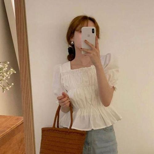 [에이치플러스몰]캐주얼벌룬소매 러플 세미크롭 반소매 상의 멀티컬러