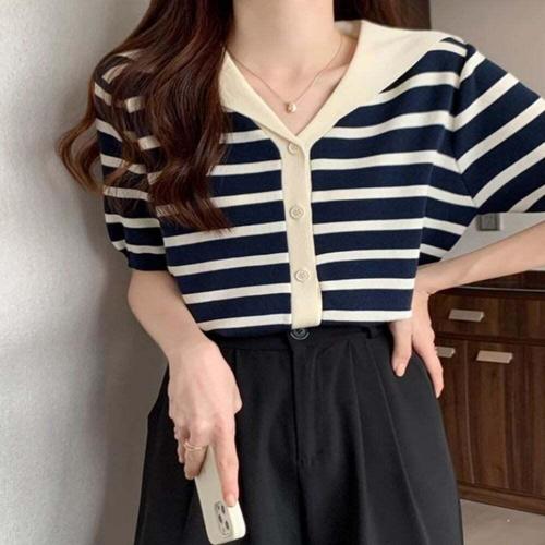 [셀럽하우스]반팔 QEYX7176 니트 가디건 세일러 카라 여름 단가라 티셔츠