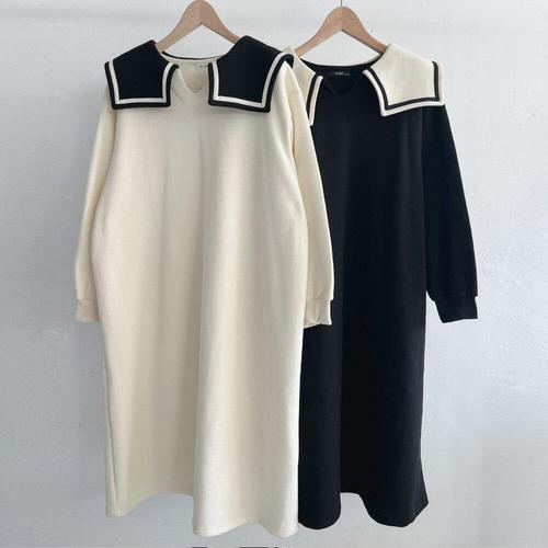 [옷자락] 여성 겨울 배색 세일러 카라 99사이즈 기모 롱 드레스