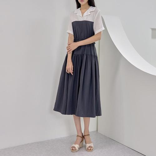 [옷자락]여성 면 레이온 핀턱 셔링 스트링 반팔 롱 원피스