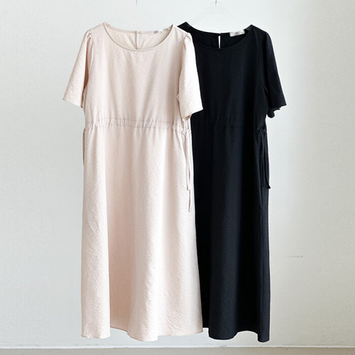 옷자락 / 여성 여름 셔링 라운드 캡소매 스트링 포켓 롱원피스