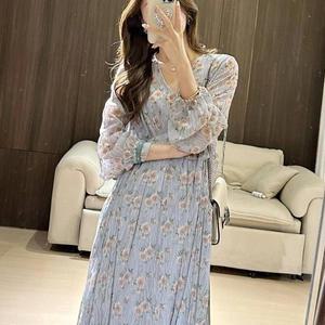 [에이치플러스몰]롱원피스 인기 라운드넥 소매핀턱 밑단 감성 셔링 플