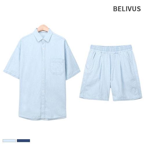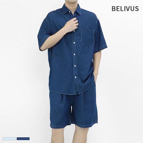 [빌리버스]빌리버스 남자 셋업 BWWT019 여름 반팔 데님 셔츠 밴딩 반바지 세트