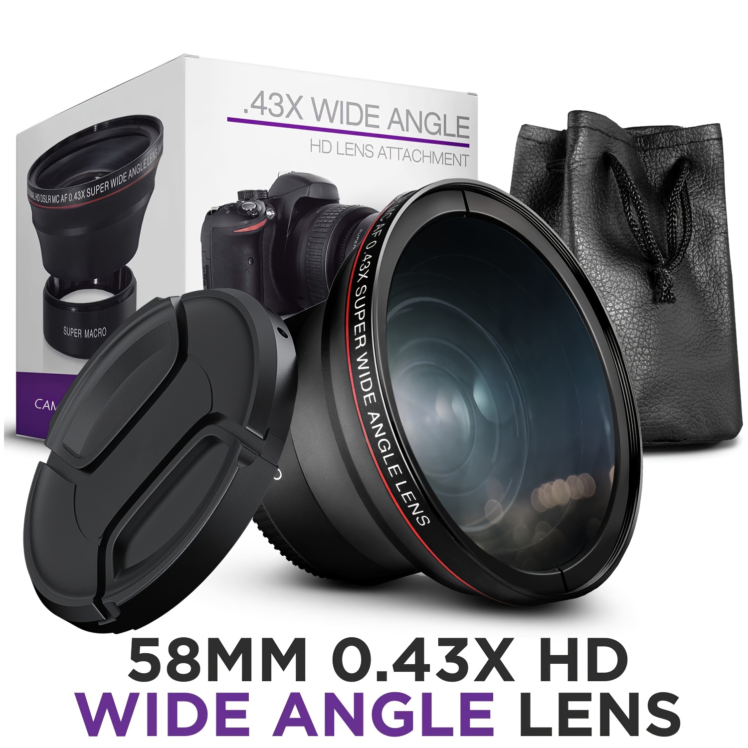 TEMU 49MM/52MM/58MM 전문가용 카메라 렌즈, 내장형 마코 렌즈가 있는 0.43X 광각 렌즈, Canon, Nikon, Sony 카메라 렌즈와 호환 가능.