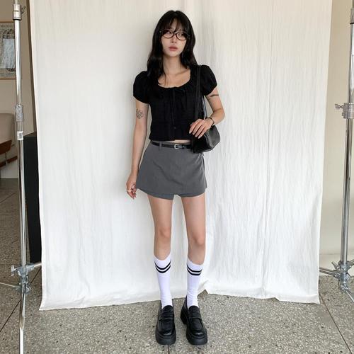 [옷자락]여성 퍼프 소매 리본 스트랩 패턴 크롭 블라우스_3