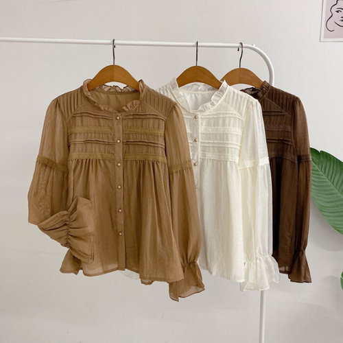 허니제이 / 레비티 핀턱 프릴 레이스 소매 커프스 블라우스(3color)