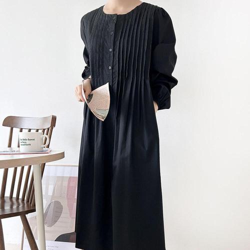 [옷자락]여성 가을 핀턱 플리츠 롱버튼 원피스 퍼프소매
