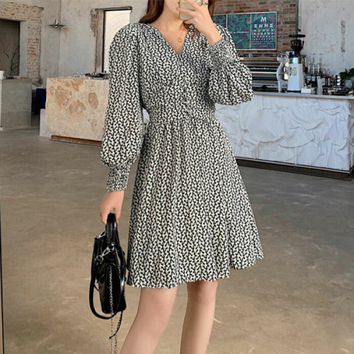 [보니제이]브이넥 퍼프소매 긴팔 미니원피스 플라워 쉬폰 셔링
