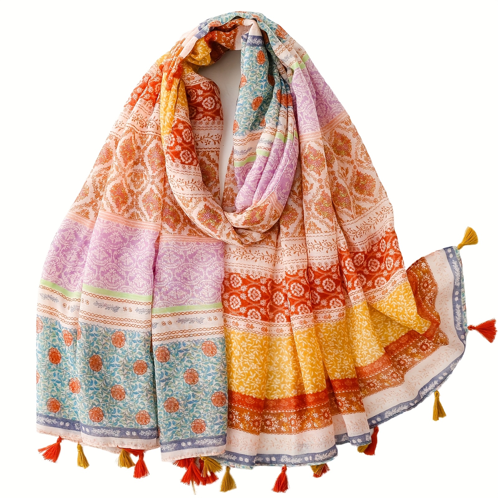 TEMU 여성용 스카프, 사계절용 따뜻한 스카프, 부드럽고 가벼운 베이지 친화적, 플로럴 기하학적 컬러 블록, , 문학적, 출퇴근 스타일, 자연스러운 톤, 오버사이즈 롱 디자인 태슬 포함, 숄, 랩, 레이어링, 여행용 액세서리 숄, 무슬림 헤드스카프