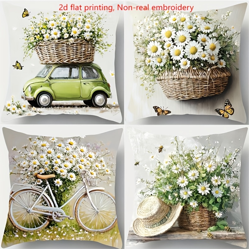 TEMU 4개 세트, 2D 평면 프린팅, 시골 테마 지퍼 베개커버, 자전거, 자동차, 꽃무늬 프린트, 따뜻하고 편안한, 아름답고 실용적인, 17.72 * 17.72 인치, 홈 소파 장식용, 홈 액세서리, 침실용 (베개 코어 미포함)