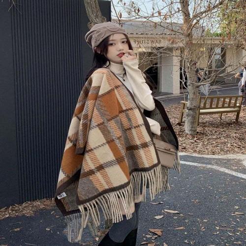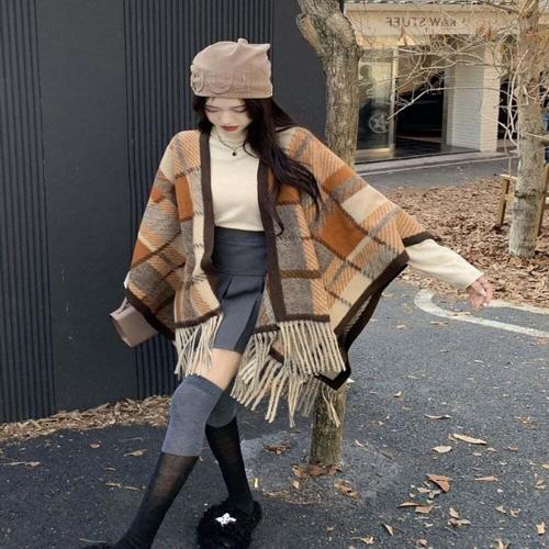 [셀럽하우스]판쵸 GCWY1209 수술 체크 가을 여자 겨울 케이프 숄 가디건