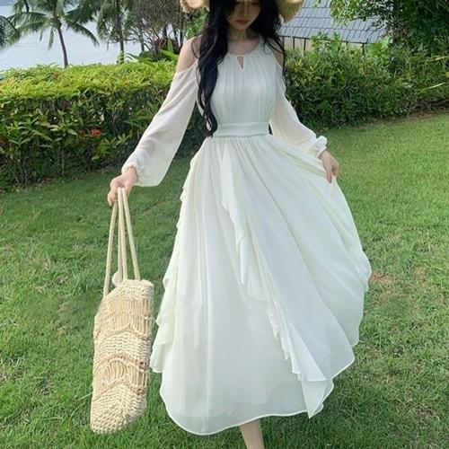 봄 가을 여성 긴팔 원피스 빈티지 하이웨이스트 원피스 캐주얼 롱 스커트 기질 바캉스룩 쉬폰 원피스 ZZL