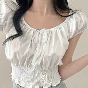 [옷자락]여성 리본 스퀘어넥 퍼프 스모크 프릴 사랑스러운 블라우스