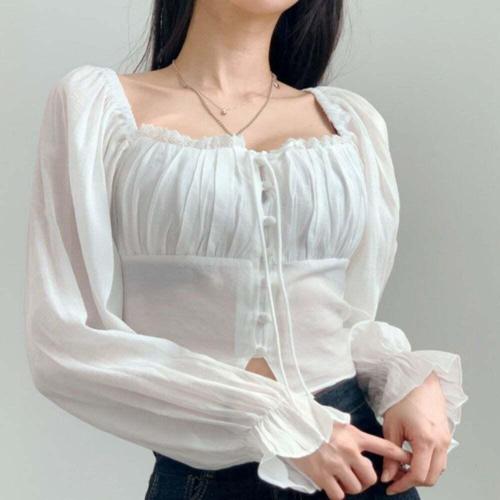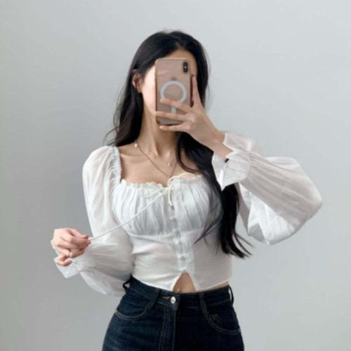 [신상오픈런]여성 리본 스퀘어넥 퍼프 소매 스모크 프릴 블라우스 (38564910)
