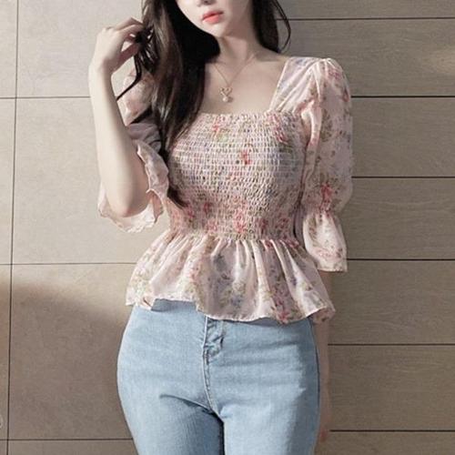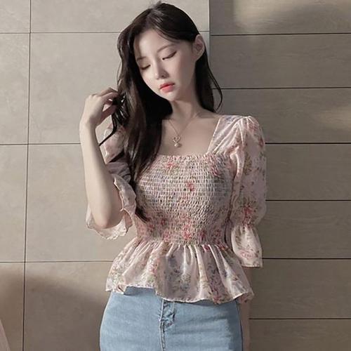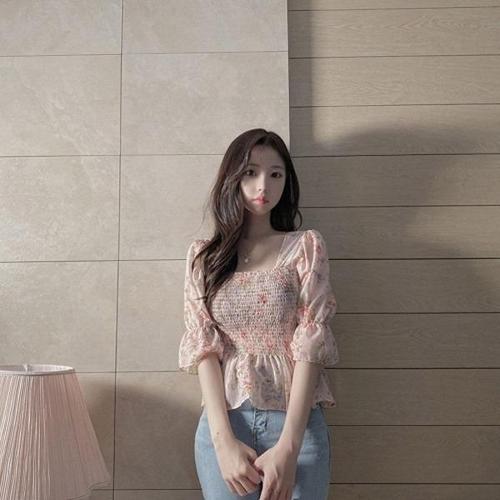 [엄지척]스퀘어넥 스모크밴딩 소매 플라워 블라우스 크롭_19660613_667501
