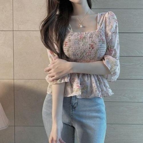 [엄지척]러블리 플라워 밴딩 셔링 스모크 스퀘어넥 블라우스_19646058_667501