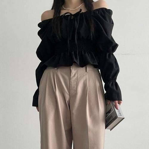 [엄지척]스모크 셔링 여성 블라우스 레이스 크롭 오프숄더_19650225_667501