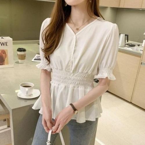[엄지척]여자 스모크 쉬폰 블라우스 여름 셔링라인 퍼프 프릴_19650933_667501