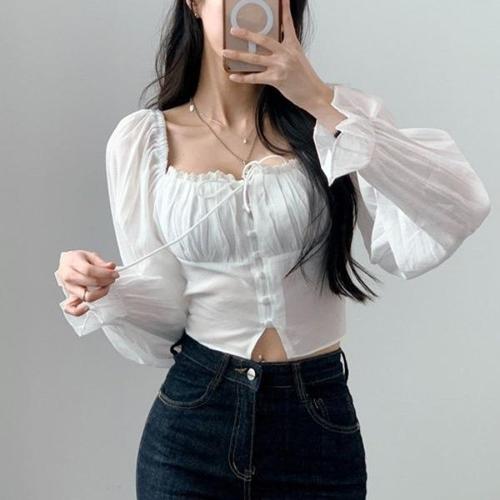 SAHINER 봄여름 여성 로맨틱 스퀘어넥 프릴 긴팔 블라우스 LWACS61