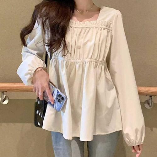 [에이치플러스몰]여성 스퀘어넥 블라우스 셔링 루즈핏 긴팔 블라우스