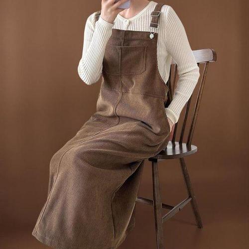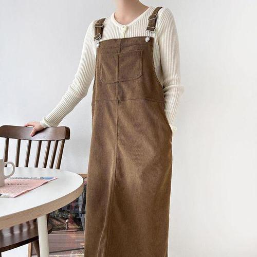 [신상오픈런]여성 골덴 멜빵 포켓 기모 뒤트임 오버핏 롱드레스