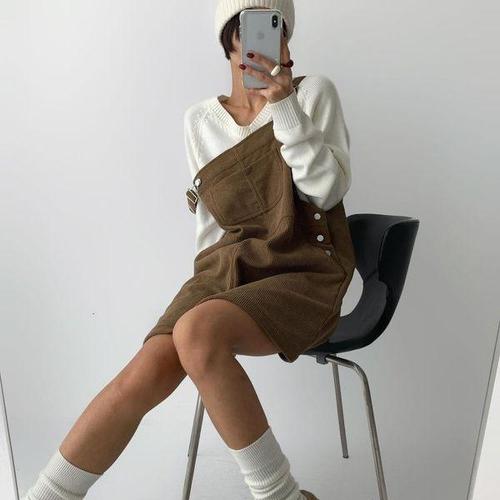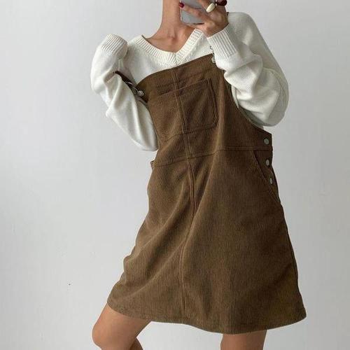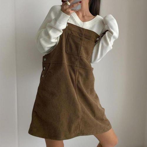 [신상오픈런]여성 코듀로이 포켓 A라인 멜빵 기모 미니 드레스