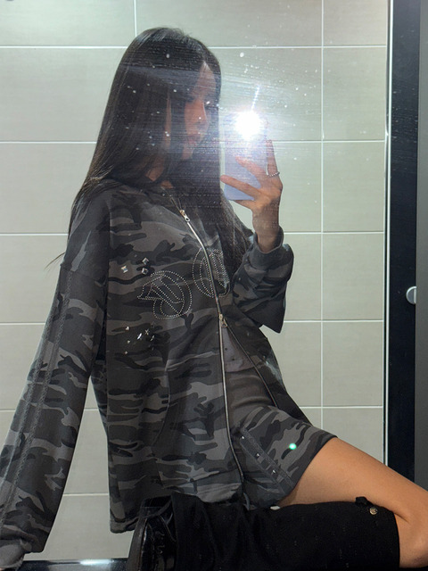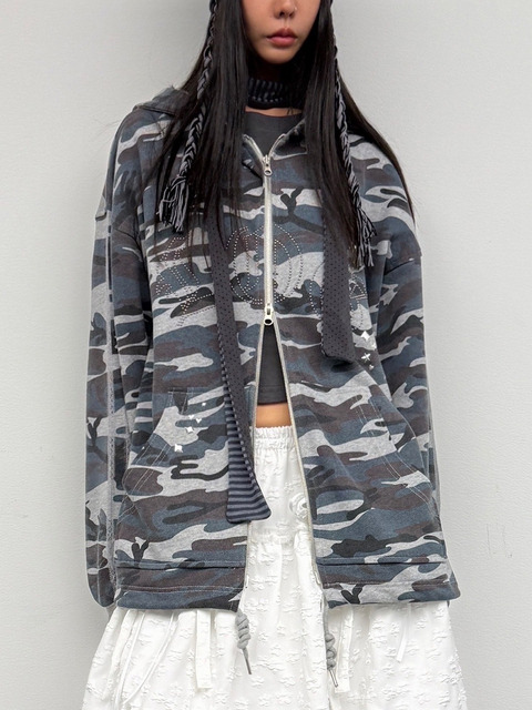 [플라즈마스페어] 밀리 카모 스터드 레이스 롱 후드 집업_멜란지그레이