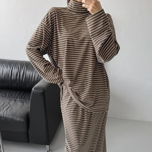 플러리싱 / 오버핏 단가라 목폴라 긴팔티 밴딩 롱스커트 set 플