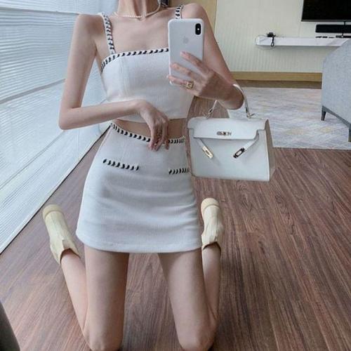 우먼 고무줄 스트라이프짜임 모던 숏기장소매없음 미니스커트 셋업
