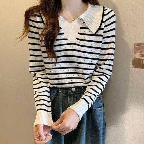 JIEVE 라운드 긴팔티 여성 가을 스트라이프 슬림 크롭 티셔츠 SL062557