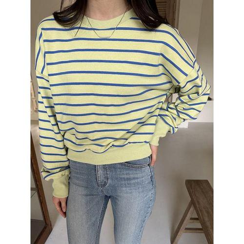 여성 캐주얼 코디룩 라운드넥 스트라이프 크롭니트티 WFL0I0Z