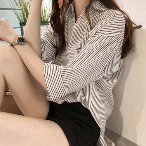 PEROLA 여성 스트라이프 긴팔 셔츠 루즈핏 캐주얼 헨리넥 벌룬소매 셔츠 (S~3XL)