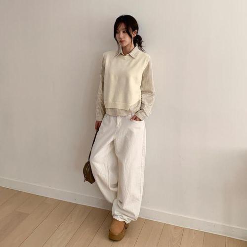 [옷자락] 여자 캐주얼 스트라이프 셔츠 오버핏 크롭 조끼 세트
