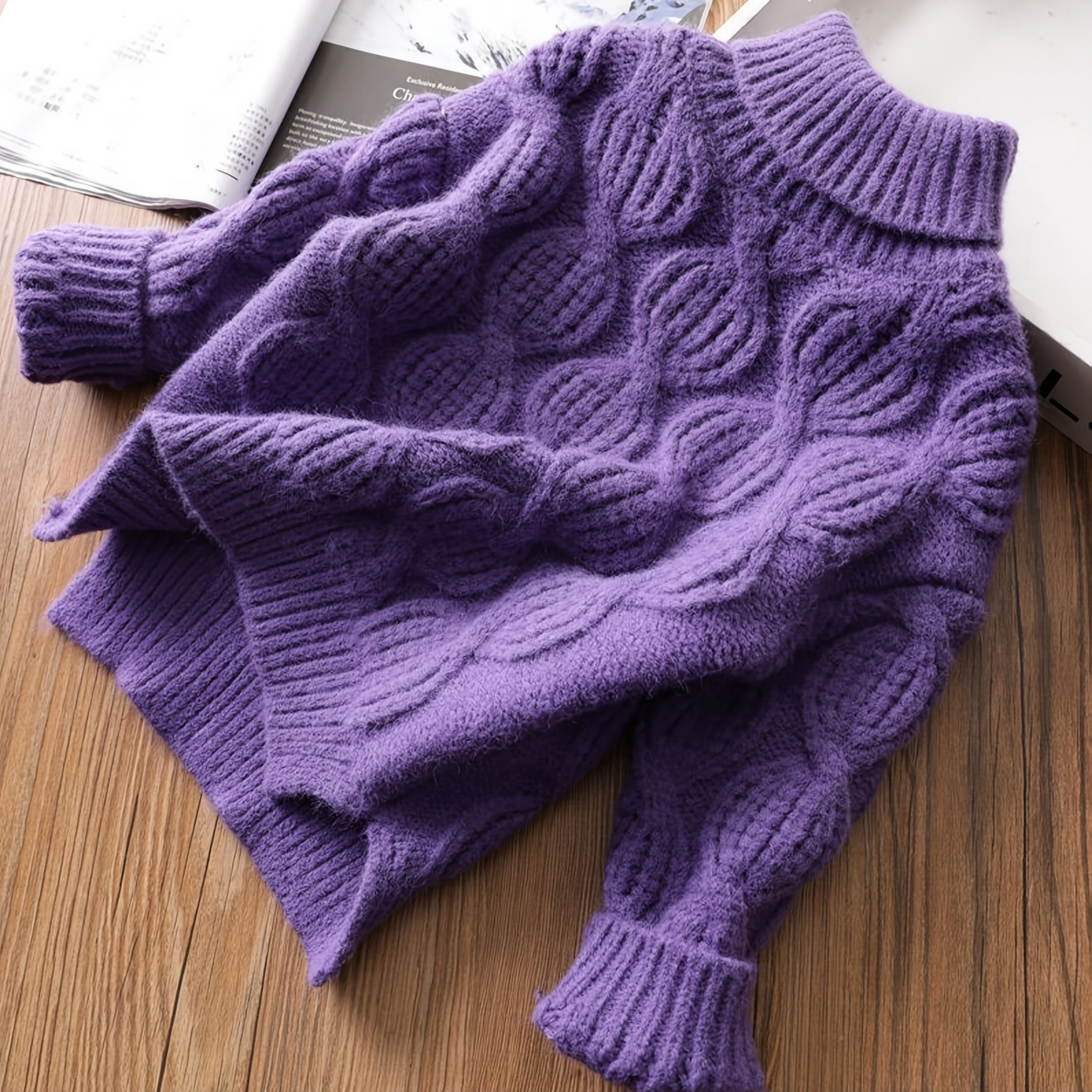 TEMU 소녀용 겨울 니트 스웨터 - 두꺼운 따뜻한 하이넥 긴팔, 신축성 있는 루즈핏 단색 풀오버, 유아 및 어린이용, 손세탁 전용, 비대칭 니트웨어, 리브드 질감